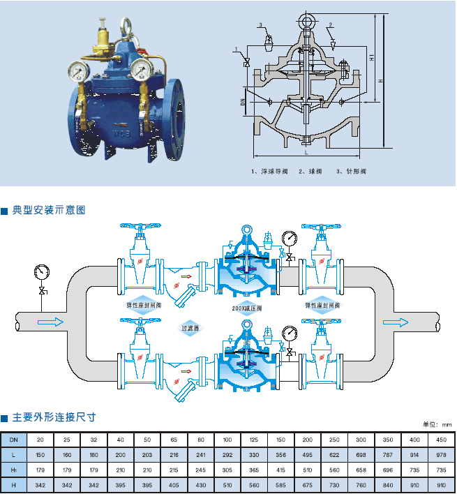 200X減壓閥是一種利用介質(zhì)自身能量了調(diào)節(jié)與控制管路壓力的智能型閥門。用于生活給水、消防給水及其他工業(yè)給水系統(tǒng),通過調(diào)節(jié)減壓導(dǎo)閥,即可調(diào)節(jié)主閥的出口壓力。出口壓力不因進(jìn)口壓力、進(jìn)口流量的變化而變化,安全可靠地將出口壓力維持在設(shè)定直上,并可根據(jù)需要調(diào)節(jié)設(shè)定直以達(dá)到減壓目的。該閥減壓精確,性能穩(wěn)定、安全可靠、安裝調(diào)節(jié)方便,使用壽命長。 |