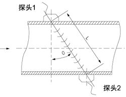 當超聲波在液體中傳播時,探頭1發(fā)射的超聲波脈沖被探頭2所接收,同時,探頭2也發(fā)射超聲脈沖,探頭1接收,則順流方向聲波傳播速度會增大,逆流方向則減小,同一傳播距離就有不同的傳播時間,利用傳播時間之差與被測流速之關系求取流速,進而得出流量,其關系式如下: |