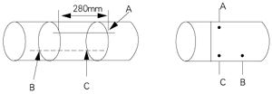 | 將球閥底座分別焊接在A和B兩點上。 注意球閥座中心點一定要分別與A和B兩點重合。 |