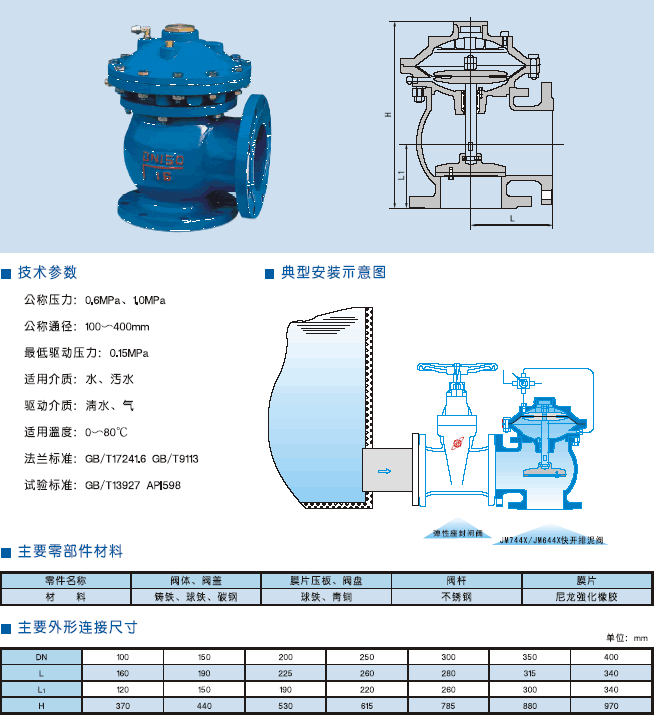 JM744X氣動(dòng)快開(kāi)排泥閥,是一種由液壓源或氣動(dòng)源作執(zhí)行機(jī)構(gòu)的角型截?cái)囝?lèi)閥門(mén)。通常成排安裝在沉淀池底部外側(cè)壁,用以排除池底沉淀的泥砂和污物。該閥由泥龍強(qiáng)化橡膠隔膜將閥門(mén)分為兩個(gè)腔室,接通液壓或氣動(dòng)源,采用電動(dòng)或手動(dòng)二位四通換向閥控制,實(shí)現(xiàn)快速排泥。該閥將隔膜代替活塞,無(wú)運(yùn)動(dòng)摩檫,更適用于泥漿等顆粒介質(zhì),大大提高了閥門(mén)的使用壽命。 |