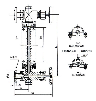 儀表上下閥都裝有PN1.6MPa,DN20的法蘭。通過(guò)焊接在容器上的法蘭,與容器組成連通器,透過(guò)玻璃管就可直接顯示容器內(nèi)介質(zhì)液位的高度。