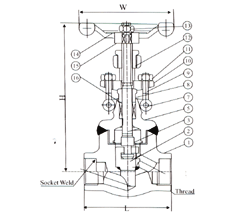 截止閥的設(shè)計(jì)與制造符合 APl602,BS53 52和ASME B16.34。檢驗(yàn)與測(cè)試按APl598,標(biāo)記按MSS-SP-25。